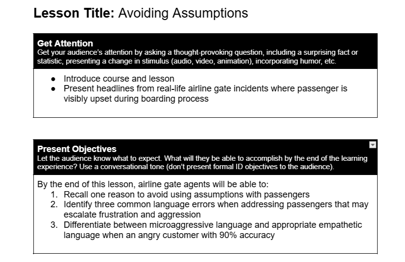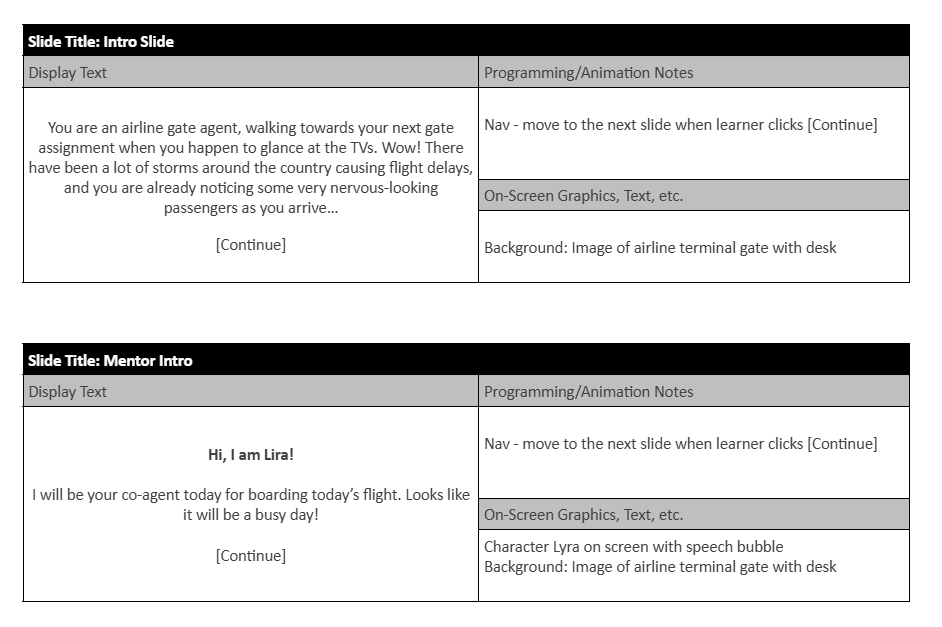 The action map guided the development of a text-based storyboard using Gagne’s Nine Events of Instruction as well as Bloom’s Taxonomy to create objectives. To model realistic interactions, I worked with SMEs to design a scenario where airline gate agents address airline passenger concerns during a flight delay.